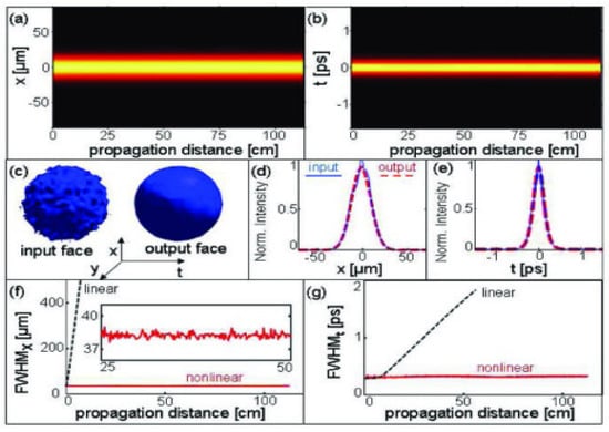 Temporally bright spatiotemporal pulse-train soliton. Intensity of the soliton in plane xz (a) and t-z (b) demonstrating the stationary propagation. (c) Intensity in x-y-t at the input and output faces of the sample. Intensity profiles in the x direction (d) and t direction (e) at the input and output faces of the sample. Width (FWHM) of the intensity in the x direction (f) and t direction (g) versus propagation distance for linear and nonlinear propagations. Reprinted with permission from [] © The Optical Society.