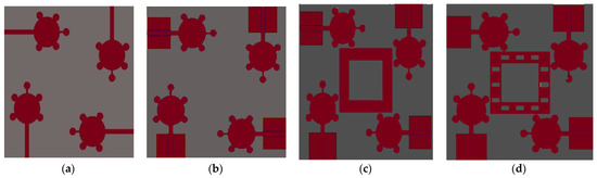 All four radiators are of the same dimensions and are arranged in an orthogonal pattern. By using this arrangement of elements in MIMO, it is possible to reduce the mutual coupling among patch elements. Four rectangular-shaped patches with a width of 8.334 mm and a length of 7 mm form the structure of the ground plane. In order to achieve good isolation, a square-shaped conducting patch with a width of 3 mm is placed on the ground at a distance of 5 mm from the center of ground plane, as shown in Figure 1b. To improve the bandwidth and isolation in UWB and ITU bands, 12 rectangular slots are placed on 3 mm square ground patch.