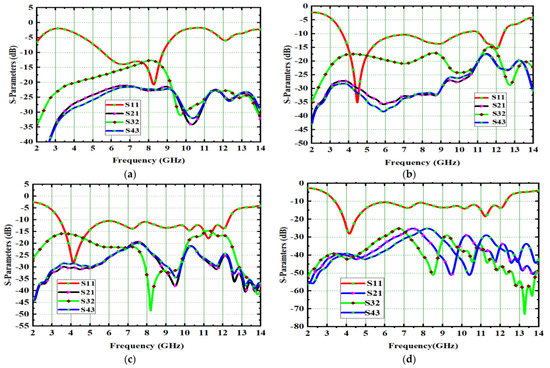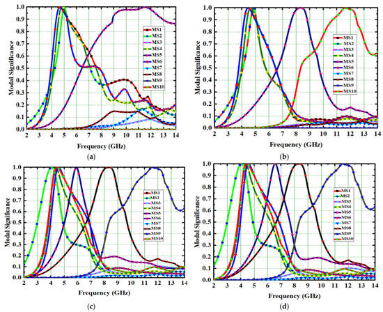 The remaining modes, CM1, CM2, CM4, CM5, CM6, CM8, CM9, and CM10, not only covers UWB but also the X-band (8 GHz–12 GHz). Figure 3d shows the corresponding modal significances. The CM4 is resonated at 4.1 GHz during the evaluation process from Ant#0 to Ant#3. As a result, CM4 is referred to as the dominant mode. All CMs are scattered in between 3 GHz and 12 GHz except CM3 and CM7. The feed is applied to all antennas and their corresponding S-Parameters are depicted in Figure 4. Placing the square-shaped ground structure in the proposed antenna, the current interactions among the radiators reduce because of the increase in current interaction between the ground conduction patch and radiators.