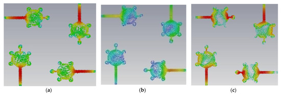 Current distribution effects on spike antenna at different frequencies for CM4 in Ant#0 at (a) 4.1 GHz, (b) 7.2 GHz, (c) 10.1 GHz.