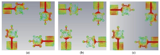 Current distribution effects on spike antenna at different frequencies for CM4 in Ant#3 at (a) 4.1 GHz, (b) 7.2 GHz, (c) 10.1 GHz.