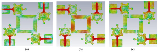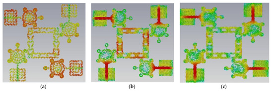 Current distribution effects on spike antenna at different frequencies in CM4 at (a) 4.1 GHz, (b) 7.2 GHz, (c) 10.1 GHz.
