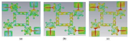 This antenna is suitable for UWB (3.1–10.6 GHz) and X-band applications (8–12 GHz). Figure 5, Figure 6, Figure 7 and Figure 8 shows the characteristic current distributions of antennas Ant#0 to Ant#3 at 4.1 GHz, 7.2 GHz, and 10.1 GHz. Figure 9 shows Ant#3′s current distributions at various frequencies.
