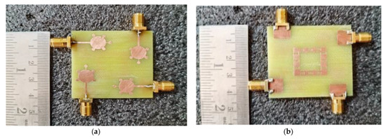 where k = 1 and m = 2. Using sophisticated decoupling methods and characteristic mode analysis this antenna achieved ECC of 0.0016 and is depicted in Figure 15b. The lesser ECC value means the antenna elements were well-isolated in MIMO. The envelope correlation coefficient (ECC) is also computed from far fields [29] and shown in Equation (5).