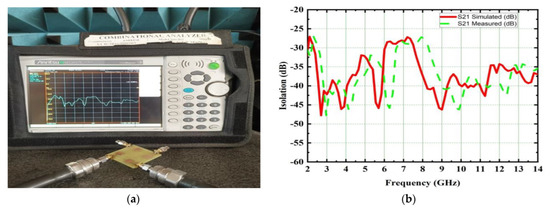 Simulated and measured isolation characteristics of the proposed spike antenna (a) S21 measurement set up using VNA (b) simulated and measured S21 comparison.