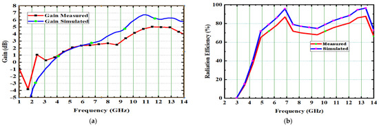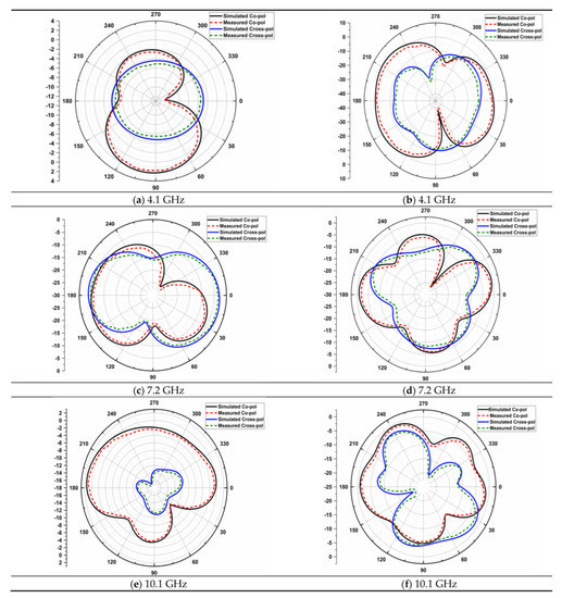 Figure 13 shows the 4 × 4 radiation patterns at 4.1 GHz, 7.2 GHz, and 10.1 GHz. The E-plane and H-plane of the primary radiator are obtained by activating its port and other ports are connected with 50 ohm load. An anechoic chamber set up is used to measure the radiation pattern, with the aid of the DRH20. The radiation efficiency is achieved as 89% and gain is 4.9 dB as shown in Figure 14.