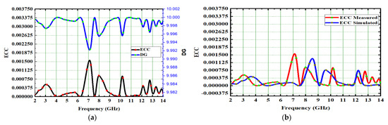 Figure 15a shows that the DG is nearly 9.962 dB. The channel capacity loss (CCL) is another important diversity parameter [30]. The number of elements in a MIMO system determines its channel capacity. In the equation, the CCL [31] is expressed as: