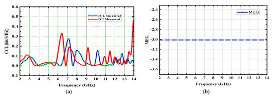 where is the event field’s trans discrimination (XPD). The gain components are represented as and for ith elements. The MEG of the intended antenna is −3.1 dB, as illustrated in Figure 16b.