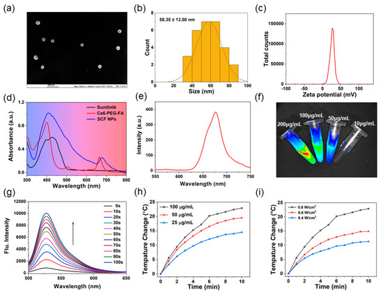 (a) SEM image of SCF NPs, scale bar: 200 nm. (b) Size distribution of SCF NPs. (c) Zeta potential of SCF NPs. (d) Ultraviolet absorption spectrum of sunitinib, Ce6-PEG2000-FA, and SCF NPs (Ce6-PEG-FA donated as Ce6-PEG2000-FA). (e) The fluorescence emission spectrum of SCF NPs in PBS. (f) The fluorescence imaging intensity of various concentration SCF NPs. (g) Fluorescence spectra of SOSG mixed with SCF NPs excited by 660 nm laser irradiation. (h) Photothermal property of SCF NPs at different concentrations under laser irradiation (660 nm, 800 mW cm−2). (i) Photothermal property of SCF NPs (100 µg/mL) with different power densities.