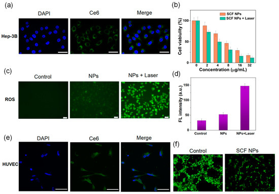 The intracellular uptake of SCF NPs was observed using a confocal fluorescence microscope with Ce6 as a fluorescent probe. As shown in Figure 2a, the green fluorescence of Ce6 could be observed within the cytoplasm of Hep-3B cells by confocal fluorescence microscopy, suggesting that SCF NPs are efficiently endocytosed by tumor cells. Biosafety assessment is critical before nanocarriers are used for biomedical research. The Hep-3B and human normal hepatocytes (LO2) were employed to evaluate the biocompatibility of Ce6-PEG2000-FA. CCK-8 assays were conducted to detect the cytotoxicity of Ce6-PEG2000-FA. As described in Figure S8, the result of CCK-8 indicated that the Ce6-PEG2000-FA showed superior biosafety. Both cell lines maintained high cell viability (>90%) even at concentrations greater than 200 µg/mL. As the nanocarrier of SCF NPs, Ce6-PEG2000-FA not only have a good encapsulation effect but also show little toxicity to normal cell and tumor cell. Then, the efficacy of combination therapy comprising phototherapy and molecular targeted therapy was evaluated. As indicated in Figure 2b, the cell survival rates of tumor cells treated with SCF NPs with or without laser radiation were concentration dependent. It is worth noting that dark toxicity of SCF NPs is rather high, with 46.5% cell viability at a concentration of 8 µg/mL. This phenomenon may be attributed to the successful loading of sunitinib, effective cellular uptake of nanoparticles, and smooth intracytoplasmic release of sunitinib. Importantly, SCF NPs exhibited strong phototoxicity, with 30.9% cell viability at a concentration of 8 µg/mL. The IC50 values of SCF NPs with or without laser irradiation are 7.8 and 4.3 µg/mL for Hep-3B cells, respectively. Therefore, SCF NPs showed remarkable synergistic therapeutic outcomes based on phototherapy and molecular targeted therapy. Subsequently, we further investigated the intracellular ROS generation of various groups by using DCFH-DA as the fluorescence probe. In Figure 2c, the strongest fluorescence emission could be detected in the group of MCS NPs with laser irradiation. The quantitative analysis of the fluorescence intensity further confirmed this result (Figure 2d). Notably, the group of SCF NPs without light irradiation also displayed a slight fluorescent signal, which may be attributed to sunitinib-induced generation of reactive oxygen species (ROS) [39,40]. In order to verify the antivascular properties of SCF NPs, a blood vessel formation experiment was performed. As displayed in Figure 2e,f, SCF NPs can be successfully taken up by HUVEC cells, and SCF NPs group could effectively fight against angiopoiesis (vascular length, tightness, and intersections significantly decreased) than the control group. Therefore, a synergistic therapeutic strategy combining phototherapy with molecular targeted therapy can effectively eliminate tumor cells in vitro.
