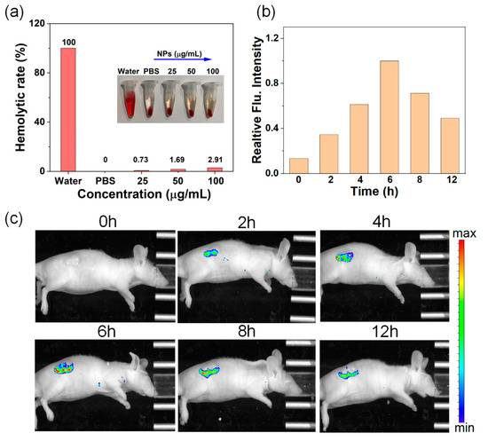 (a) Hemolysis experiment with different concentrations (25, 50, 100 µg/mL) of SCF NPs. (b) Quantification of the fluorescence signal of Hep-3B tumor-bearing mice before and after intravenous injection with SCF NPs. (c) Real-time fluorescence imaging of SCF NPs.