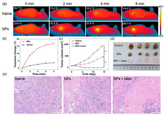 (a) IR thermal images of mice bearing Hep-3B tumors injected with saline or SCF NPs, irradiated with 660 nm laser (600 mW cm−2). (b) The curves of temperature changes at the tumor site under laser irradiation. (c) Tumor volume growth curves of various groups. * p < 0.05. (d) Images of dissected tumors from different groups (Control, SCF NPs, SCF NPs with laser radiation). (e) H&E staining of tumor tissue for each group, scale bars: 50 µm.