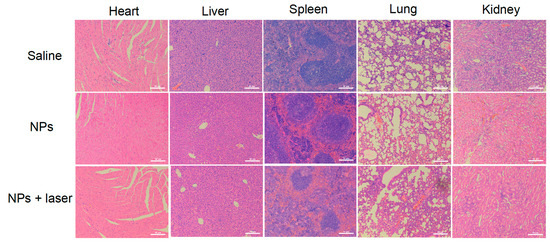 H&E staining for major organ sections (heart, liver, spleen, lung, and kidney) from different groups of mice. Scale bar: 50 μm.