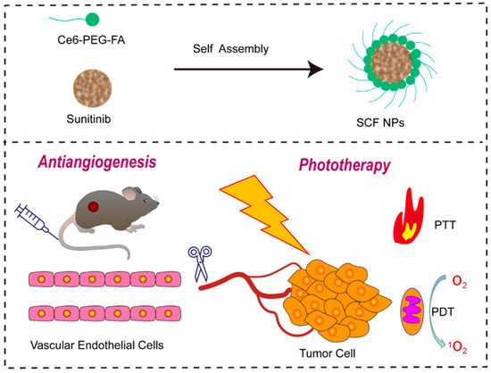 Herein, we employed an amphiphilic polymer (Ce6-PEG2000-FA) to fabricate a novel nanoparticle by self-assembly method, sunitinib@Ce6-PEG2000-FA NPs (SCF NPs), with synergistic antivascular activity and PDT/PTT [36,37]. Sunitinib can induce apoptosis of vascular endothelial cells, thereby inhibiting tumor angiogenesis. Meanwhile, Ce6-PEG2000-FA can achieve PDT and PTT, killing HCC cells. Furthermore, folate receptors on the surfaces of HCC cells can be targeted by the FA molecules of the Ce6-PEG2000-FA to enhance the active targeting capability of NPs [38]. Accordingly, the resulting SCF NPs not only possess excellent passive (enhanced permeability and retention effect) and proactive (folate receptors) targeting ability towards tumors but also present superior synergistic effects with anti-angiogenic therapy and phototherapy (Scheme 1).