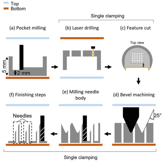 Overview of the HMNA fabrication process. (a) A pocket with a 2 mm thick bottom is created, in which (b) lumens are laser ablated, followed by (c) a reference feature cut (yellow line) in a single step. Then, in a single clamping on the micro-milling center, (d) the bevels were machined first followed by (e) milling the needle body and (f) finishing steps.