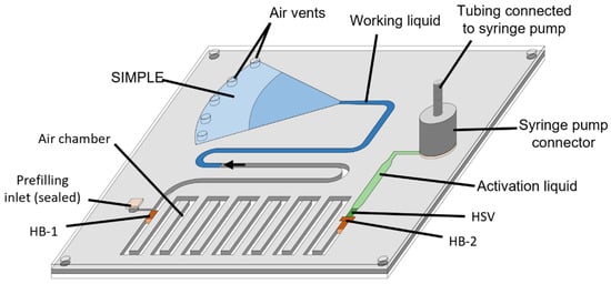 Measurements of the pressure generated by the SIMPLE were based on Boyle’s law, which describes the relationship between the pressure (P) and volume (V) of an ideal gas given a constant temperature as PV = k, with k a certain constant. Therefore, a pre-defined air volume enclosed in an air chamber on-chip was expanded by the SIMPLE. Figure 2 depicts the chip design used. A Harvard PHD 2000 syringe pump (Harvard Apparatus, Holliston, MA, USA) was operated to push the activation liquid (1/50 diluted green aqueous dye in distilled water) further toward the HSV at a flow rate of 35 μL/min, leading to the activation of the pump by pushing the working liquid into the filter paper tip. As soon as the HSV was saturated, the syringe pump remained connected after stopping the flow rate. During the wicking of the working liquid (1/50 diluted blue aqueous dye in distilled water) by the porous material of the SIMPLE, which created negative pressure in the air chamber, the activation liquid was prevented to leak from the HSV to the air plug chamber by means of the HB-2.