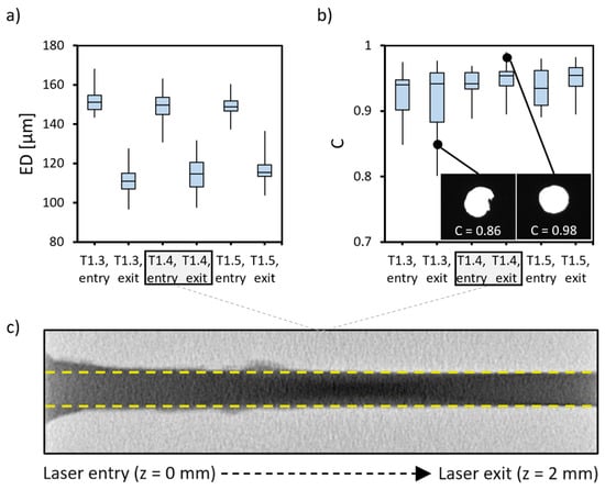 Boxplots for a laser output energy of 1.0 J showing (a) the obtained EDs of laser drilled lumens at the laser entry and exit sides for different pulse durations (1.3, 1.4, and 1.5 ms), and (b) the C values for the same laser drilled lumens. The boxes in the boxplots display (from top to bottom) the upper quartile, the median and the lower quartile. Whiskers indicate the minima and maxima (n > 22 for all conditions) and insets show examples of BF microscopy images obtained and the corresponding results. (c) A cross-section by μCT scanning of a lumen percussion laser drilled with energy 1.0 J and pulse duration 1.4 ms. The yellow dashed lines indicate the width at the laser exit side, demonstrating the nearly straight microlumen and substantial widening near the laser entry side.