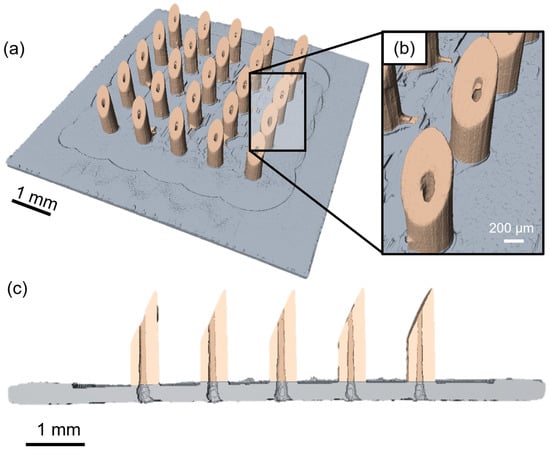 Even though the targeted microlumens were obtained, the significantly higher ED (p < 0.05) for the laser entry versus exit sides suggested a significant amount of taper. To visualize this in detail, microlumens fabricated with the laser settings combination 1.0 J and 1.4 ms were scanned by μCT. The cross-section in Figure 3c shows that, in fact, nearly straight microlumens were achieved with the diameter only considerably increasing at the laser entry side. Based on this, it was decided to laser drill the lumens from the backside of the workpiece to let the wider laser entry side coincide with the HMNA base plate instead of the tip.
