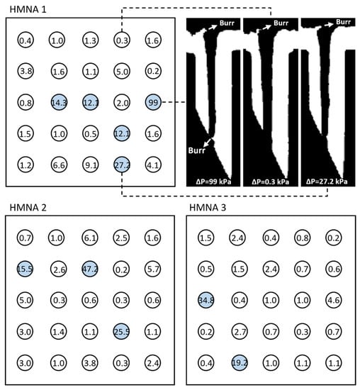 Spatial distribution of the measured average (n = 3) pressure drops (kPa) for 3 different arrays at the flow rate of 50 μL/min. Pressure drops > 10 kPa are indicated in blue. For information on the errors resulting from the three technical repetitions, the reader is referred to Figure S5 in the Supplementary Information. The presence of machining artifacts such as burrs can partly be visualized by μCT, as shown by the binarized cross-sections of 3 HMNs for HMNA 1.