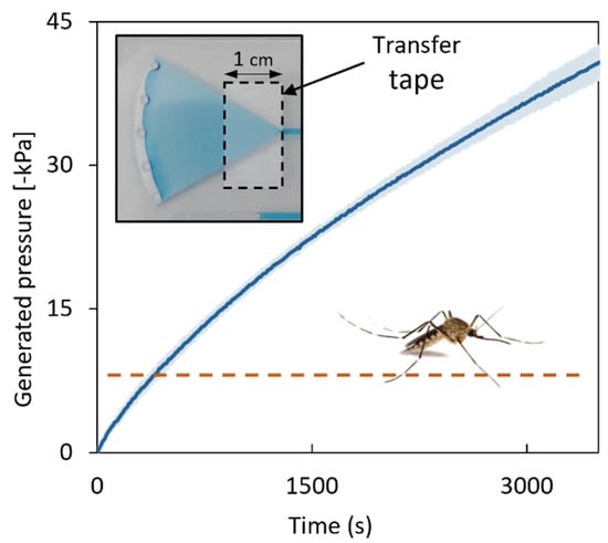 Average generated pressures by the SIMPLE chip reinforced by sealing the filter paper pump tip with transfer tape (see inset). The shaded area represents 1 standard deviation (n = 4). The orange dashed line depicts the reference pressure difference as generated by a mosquito when pulling blood from skin capillaries.