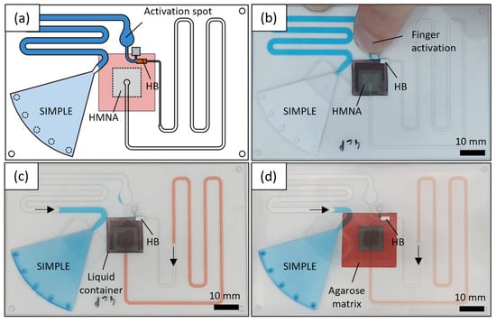 Finally, a self-powered microsampling patch was assembled by integrating an HMNA with an SIMPLE chip using a PSA connection. The patch has the size of a regular credit card (86 × 54 mm2, design shown in Figure 7a), an ideal feature for self-sampling applications. The chip can be easily activated by a finger press on the activation spot (Figure 7b) to bring the working liquid (blue) into contact with the filter paper pump, which starts creating a pressure difference to withdraw the sample.