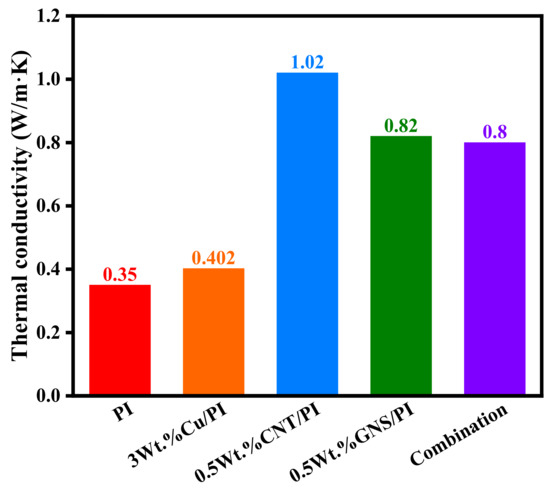 - Carbon nanotube (CNT) and graphene can improve the performance of PI very well. The 0.5 wt.% mass fraction of carbon nanotubes can, respectively, increase the axial thermal conductivity by 115.8%, and the maximum thermal conductivity of graphene in the two-dimensional plane direction can increase by 168.4%. Both of them can effectively reduce the friction and wear of the composites and make the composites have excellent tribological properties. However, the strength of the composite decreases as the content of carbon nanotubes and graphene continues to increase.