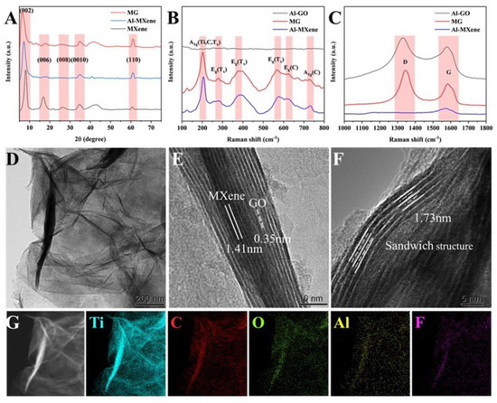 In the transmission electron microscopy (TEM) image (Figure 1D), many irregular folds can be observed on the surface of the MG, which is quite different from the rigid MXene. High resolution transmission electron microscopy (HR-TEM) (Figure 1E) can observe lattice spacing of 1.41 nm and 0.35 nm, corresponding to the (002) crystal plane of MXene and rGO, respectively [24,25]. A sandwich structure (1.73 nm) shown in Figure 1F may be attributed to the embedding of GO between MXene layers, demonstrating the heterogeneous assembly of MXene. This structure could inhibit further stacking of MXene. Energy dispersive spectroscopy (EDS) plots (Figure 1G) show a uniform distribution of Ti, C, O, Al, and F throughout the field of view, indicating the coexistence of MXene and rGO and the cross-linking effect of Al3+ between MXene and rGO nanosheets.