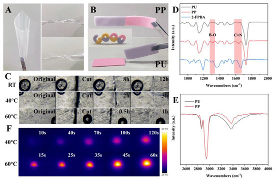 Figure 3. Self-healing properties of PP. (A) PP can be bent, twisted and knotted. (B) PP can heal itself at room temperature, while PU cannot. (C) Optical microscope observation of the self-healing ability of PP at different temperatures. (D,E) FT−IR. (F) Infrared thermal images of MGPP during warming up.