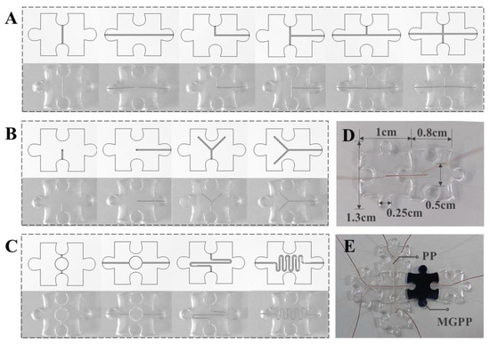 The module of the puzzle shape is 1.3 cm long and 1 cm wide, and the diameter of the circular piercing point is 0.25 cm. The entire mold was covered with PP and MGPP just above the mold surface height. The covered modular mold was then placed under a vacuum until the surface was stationary and free of air bubbles. After drying at room temperature, the modular components were slowly extracted from the mold surface by applying moderate pressure. The components could be quickly extracted without damaging the mold or the components. Ink was injected to check for leaks.
