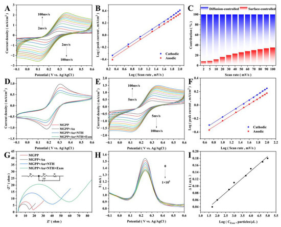All electrochemical measurements were performed on an electrochemical workstation (CHI 660e). Electrochemical properties were tested in a 0.5 mM [Fe(CN)6]3−/4− solution containing 0.1 M KCl under a three-electrode system. Ag/AgCl and platinum wire electrodes were used as reference and counter electrodes. Cyclic voltammetric (CV) and electrochemical impedance spectroscopy (EIS) measurements during the stepwise modification of the biosensor were recorded at a sweep speed of 10 mV/s and in the frequency range of 0.1–100 kHz, respectively. According to the equation log(i) = blog(v) + loga, calculating the slope can distinguish the electrochemical behavior. Moreover, the contribution of each component to the current can be further quantified by i(v) = k1v + k2v1/2. Differential pulse voltammetry (DPV) measurements were performed for exosomes at concentrations of 0, 50, 102, 5 × 102, 103, 5 × 103, 104, 5 × 104, and 105 particles/μL in the potential range of −0.1 V to 0.6 V, respectively. The sensing platform’s sensitivity, smoothness, and reproducibility were tested using exosome concentrations of 103 particles/μL.