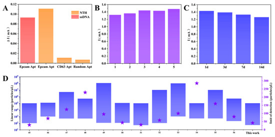 Figure 5H demonstrates the DPV behavior of the electrochemical sensing platform at different concentrations of exosomes. The DPV current decreases with increasing exosome concentration due to TDN blocking some channels for electron/ion transport between the electrode and the electrolyte [46,49]. The peak DPV current shows an excellent linear relationship with the log value of the concentration at exosome concentrations of 50–105 particles/μL [50,51] (Figure 5I). The linear regression equation was ΔI = 0.0418logCExos−0.0238 (R2 = 0.989), and the LOD was 42 particles/μL (S/N = 3). This indicates that the sensor has a high sensitivity [52,53].