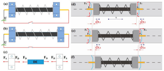 In the assembly process of SRDE, the spring between two endcaps remains in compression. After assembly and staying free, the inside RDE transforms to a stretched state due to partial release of the compressive spring, as shown in Figure 2a. When subjected to a high voltage, the RDE becomes compressed radially for the Maxwell stress generated by the electric field, causing the spring to further release, as shown in Figure 2b. If using an AC signal instead of the constant voltage, the force FD applied to the endcap by RDE shown in Figure 2c will change in the period correspondingly, causing the axially periodic elongation and contraction of the SRDE.