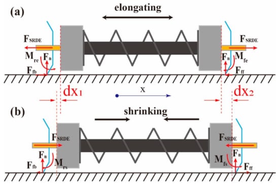 If the pipe inner diameter exceeds the bristles’ outer diameter, there exists another way to realize directional crawling, as shown in Figure 3 [13,40]. Considering that both the end-bristle lower legs are in contact with the pipe wall in the same slope, during the elongation of the SRDE (Figure 3a), since the bristle upper legs are free of external force, a counterclockwise bending moment Mfe and a clockwise bending moment Mre will apply to the front-bristle lower leg and the rear-bristle lower leg, respectively. These two bending moments make the front-bristle lower-leg tip trend to move up and left and the rear-bristle lower-leg tip trend to move down and right, leading to a decreasing friction Fff, and an increasing friction Ffb. Therefore, the forward displacement dx2 of the front bristle is higher than the backward displacement of the rear bristle dx1. Similarly, during the shrinkage of the SRDE (Figure 3b), the forward displacement of the rear bristle is higher than the backward displacement of the front bristle. Finally, after an entire period, the middle body crawls forward for a displacement dx2dx1 (here we also assume that both bristles have the same nominal Fff and Ffb).