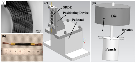 Figure 4. (a) The physical body of the RDE (b) The cross-section of the RDE. (c) The assembly device of the SRDE. (d) The stamping die of the bristle (each bristle is stamped five times manually in this work).