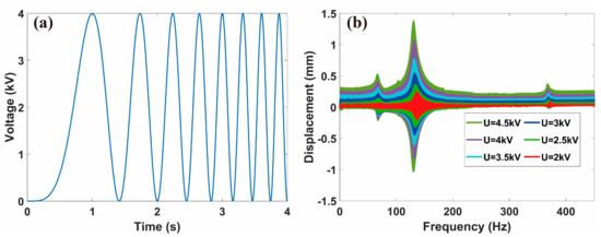 Following references [43,44], we use the “chirp” function in MATLAB® to generate sweep frequency signals, which are then converted to analog signals and transmitted into a high voltage amplifier (HVA, 10/40A-HS, Trek) by Data Acquisition (DAQ, NI-USB 6363, National Instruments). Finally, a high voltage with dynamic frequency sweeping excitation is applied to the SRDE. Figure 6a shows the schematic diagram of the sweep bias signal, indicating that the AC signal frequency continuously changes from 0 to 4 Hz at a rate of 1 Hz/s with the peak voltage (Up) of 4 kV. Figure 6b shows the dynamic response results of the SRDE sweep frequency from 0 to 450 Hz at different Up values. It can be seen that the SRDE exhibits a significant amplitude only when the excitation frequency reaches the resonant frequency. As Up increases, the amplitude increases obviously. According to the experimental results, as Up increases to 4.5 kV, there are three peaks, whose corresponding frequencies are 65 Hz, 130 Hz, and 367 Hz, respectively. The middle peak has the maximum amplitude of 2.73 mm.