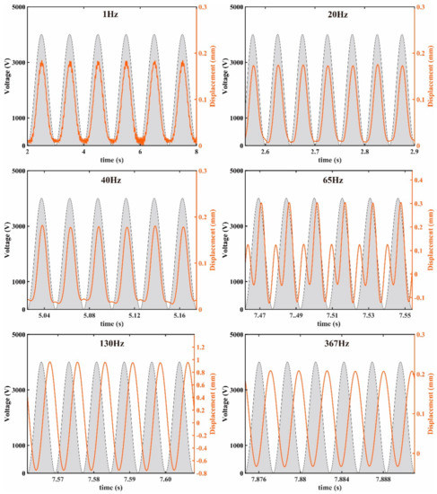 The “chirp” function in MATLAB® can analyze the driver dynamics quickly by changing the excited frequency constantly. However, the subsequent crawling robot is tested at a fixed frequency. Thus, 1 Hz, 20 Hz, 40 Hz, 65 Hz, 130 Hz, and 367 Hz were selected for fixed frequency measurements to observe the displacement response. The test results under the Up of 4 kV are shown in Figure 7, and the amplitude is the sum of the absolute values of the maximum and minimum displacement over a period. It can be seen that the amplitudes of 1 Hz, 20 Hz, and 40 Hz are very close to 0.18 mm. The amplitude at 65 Hz is higher than 0.18 mm, but its displacement curve is different from that of the other frequencies, similar to the dynamic response at 50 Hz in reference [20]. The amplitude is the highest at 130 Hz, reaching 1.72 mm. The amplitude at 367 Hz is 0.24 mm, slightly higher than that of 1 Hz, 20 Hz, and 40 Hz. It should be pointed out that a significant phase delay between the displacement and the signal appears when the excited frequency exceeds 65 Hz. In addition, the phase delay increases with increases in the excited frequency, which is related to the modulus and viscosity of the DE material [20,43].