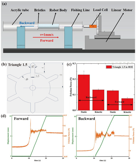 Figure 8. (a) The schematic diagram of the bristle friction test device. (b) The geometry of bristle. (c) The friction test results of the bristle in 18 mm diameter acrylic pipe (tested five times and the results are averaged). (d) The friction test data of moving forward and backward.