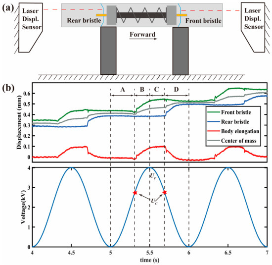 Figure 9 shows the crawling locomotion of the robot in one period under the excited frequency of 1 Hz. The displacement data are measured with double-laser displacement sensors respectively located at both ends of the pipeline, as shown in Figure 9a. From Figure 9b, it can be seen that the crawling locomotion in one period consists of four steps: A, B, C, and D. In step A (0 to UC (~2.7 kV), also called critical voltage), the front bristle, rear bristle, body length, and center of mass have little displacement because of the lower driving force produced by the voltage-induced Maxwell stress. In step B, the input voltage further increases to Up, resulting in a higher driving force and the front bristle moving forward obviously. However, because the friction Ffb is much higher than Fff, it is hard to see that the rear has significant backward movement in this stage. Similarly, in step C, the rear bristle also cannot move back visibly. In addition, due to the inertia, when the voltage decreases from Up to UC, the front bristle moves forward for a little displacement that is significantly lower than that in step B. In step D, as the voltage further decreases, the Maxwell stress drops significantly, leading to the body shrinking and the rear bristle relatively moving forward for a large displacement. Additionally, this result proves the principle shown in Figure 2.