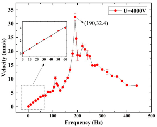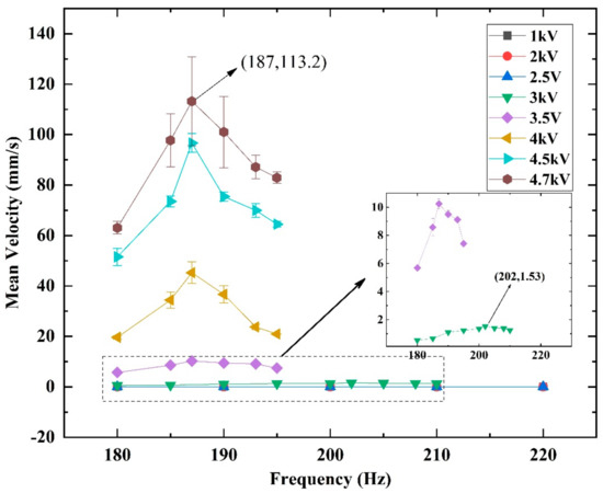 Figure 6 indicates that Up has a positive effect on the amplitude of the SRDE, implying that varied Up can cause a different crawling performance, as illustrated in Figure 12. When Up is lower than UC (~2.7 kV) in the range of 1 kV to 2.5 kV, the robot has no ability to crawl. As Up increases to 3 kV, the robot begins to crawl slowly at a maximum rate of 1.53 mm/s. When Up reaches 4.7 kV, the maximum speed reaches 113.2 mm/s, equivalent to 1.88 BL/s, as shown in Figure 13 and Video S1. In addition, the results show that Up also affects the resonant frequency of the robot: from 3.0 kV to 4.0 kV, the resonant frequency gradually decreases from 202 Hz to 187 Hz. However, as the Up further increases, the resonant frequency remains constant. It should be pointed out that the resonant frequency shown in Figure 10 has a little difference from that shown in Figure 12. This is because the test frequency increments in Figure 10 are 5 Hz or 10 Hz, larger than the increments of 2 Hz or 3 Hz in Figure 12.
