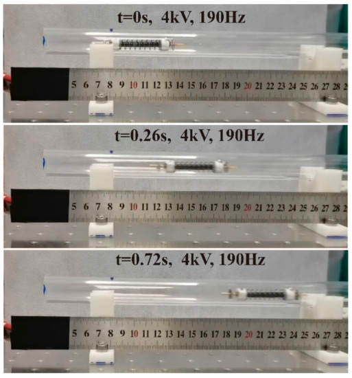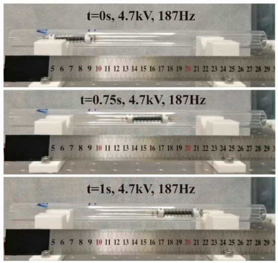 Figure 13. Photograph of the robot crawling in Φ18 acrylic pipe at Up of 4.7 kV and excited frequency of 187 Hz (Video S1).