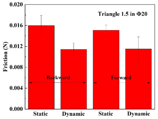 Firstly, the friction of the robot crawling in an acrylic pipe with an inner diameter of 20 mm (Φ20) is tested by the same method as shown in Figure 9a. The result is shown in Figure 14, where we can hardly observe significant differences between forward motion and backward motion. However, note that the legs of the front bristle and rear bristle are in parallel and at an acute angle to the tube wall. This results in the crawling mode shown in Figure 3, and Figure 15 demonstrates the crawling capability.