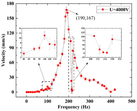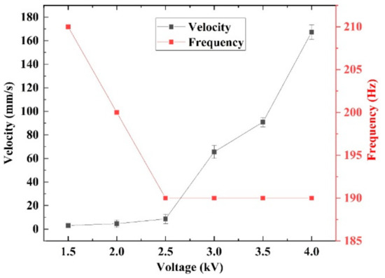 Similar to the crawling performance in the Φ18 pipe, Up also affects the crawling performance in the Φ20 acrylic pipe. The influence of Up is shown in Figure 17. When Up is lower than 2.5 kV, the speed increases slowly. However, as Up increases above 2.5 kV, the speed increases significantly. In addition, the influence of Up on the resonant frequency in Figure 17 is similar to that in Figure 12: when Up is lower than 2.5 kV, resonant frequency decreases with the increase of voltage; as Up exceeds above 2.5 kV, the resonance happens at a constant frequency of 190 Hz, which is slightly higher than the 187 Hz of the crawling in the Φ18 pipe.