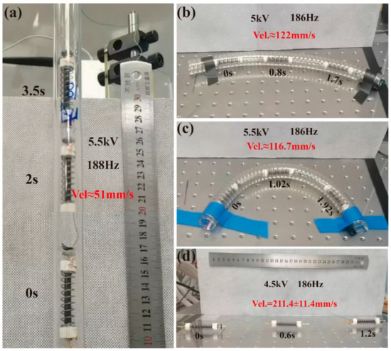 Based on the fact that the robot can crawl in the acrylic pipe whose inner diameter is larger than the robot’s external contour, we speculate that the robot can also crawl on a flat surface, which is demonstrated in Figure 18d. In case of Up being 4.5 kV and a driving frequency of 186 Hz, the crawling speed can reach 211.4 mm/s, equivalent to 3.52 BL/s.