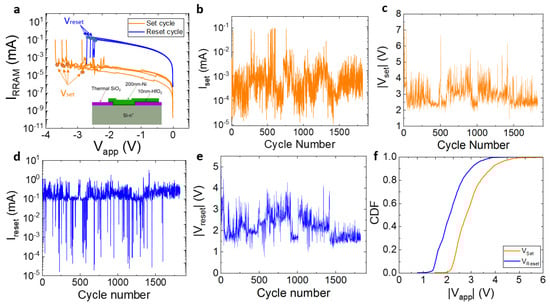 The current–voltage (I-V) measurements were performed with a HP-4155B semiconductor parameter analyzer (Hewlett Packard, Palo Alto, California, United States). A negative voltage was applied to the top Ni electrode and the Si substrate was grounded. Successive I-V measurements for long RS series were obtained; the I-V meter was connected to the computer via GPIB (General Purpose Instrumentation Bus) and controlled using MATLAB (Matlab2020, Mathworks Inc, Natick, Massachusetts, United States). This allows us to automatically detect the reset current drop and subsequently stop the voltage ramp. Notice that a current compliance of 100 µA was employed during the set process. A total of 1800 successive RS cycles were measured; some I-V curves are shown in Figure 1a. The set and reset voltages and currents are plotted versus cycle number in Figure 1b–e. The cumulative distribution functions of the set and reset voltages are plotted in Figure 1f. The set and reset voltage were calculated by detecting current differences as described in MS2 and MR2 techniques in [].