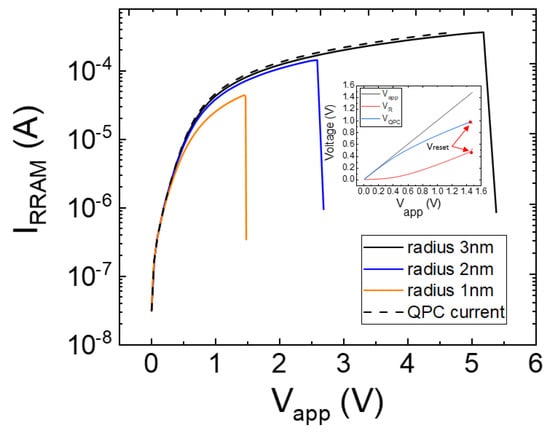 where IRRAM is the device current and RCF is the filament resistance. We simulated several I-V reset curves to assess the influence of the different components contributing to the current. For the sake of simplicity, we consider voltage absolute values henceforth. In Figure 2, the total current is plotted in solid lines, while the QPC current component (i.e., the QPC current assuming a null RCF) is shown in dashed lines (the QPC parameters are similar for all the curves shown). At low voltages, the I-V curve is mainly influenced by the QPC component; however, as the CF resistance rises, the ohmic component role increases, and the total current drops in comparison to the isolated QPC current component. Note that as the CF radius rises (a cylindrical CF shape is assumed here), the ohmic component influence decreases. As the current increases, the VQPC weight with respect to VR in the total device voltage (Vapp) changes (see the inset in Figure 2). We simulated three different reset I-V curves for similar devices with cylindrical CFs with the following radii: 1 nm, 2 nm, and 3 nm. The I-V curves are identified as cycles #1, #2, and #3, respectively.