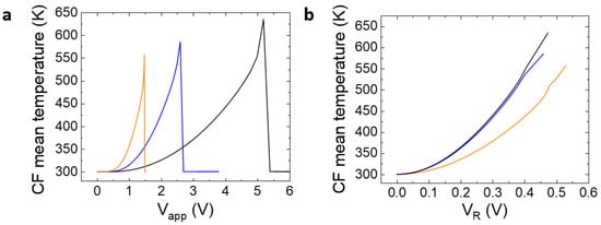 We obtained the CF temperature by simulating I-V curves and fitting several experimental curves (see Figure 5a). In each case, the QPC model parameters and the CF shape were tuned. The ohmic resistance (RCF) component was extracted and plotted separately (Figure 5b); the simulated CF mean temperature was also calculated (Figure 5c). An average was calculated with the point-to-point distribution in the filament. Assuming the CF shape fitted in Figure 5a, RCF was calculated, and the experimental CF temperature (using Equation (5)) could be estimated (see the dashed lines in Figure 5d). See that the extracted temperature is closer to the CF maximum temperature (plotted in Figure 5d) than to the CF mean temperature (Figure 5c).