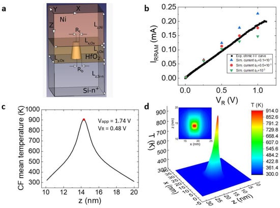 The structure we simulate is shown in Figure 4a, where Rt and Rb stand for the CF top (Ni/HfO2 interface) and bottom (Si-n+/HfO2 interface) radii. Here, we obtain the temperature at each point of the simulation domain (Equation (1)); however, these data cannot be determined experimentally []. Therefore, a single temperature value is associated to the CF for each applied voltage for modeling purposes, which can be employed in simulators based on circuit breakers and in compact models. To shed light on this issue, a methodology to estimate the average conductive filament temperature is proposed, following []. A different perspective, although related to the one reported in [], could also be employed for the average CF temperature extraction []. We attribute the CF resistance change in the low-voltage part of the reset I-V curves to the CF temperature increase (the CF shape is assumed to be fixed at these temperatures); see Equation (5) for the resistivity which determines the CF resistance for a fixed CF volume (in the LRS, we neglect charge conduction outside the CF):