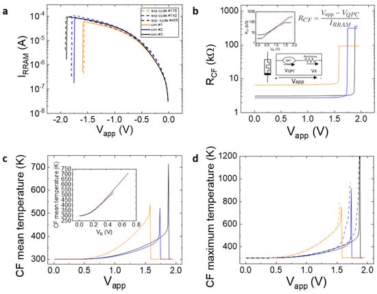 This result makes sense since the temperature at the CF narrowing (where the higher temperatures are produced by the current lines funneling) determines the CF rupture and formation that triggers the reset and set processes. We also calculated the temperature following Ref. [] and found no significant differences with the results plotted in Figure 5d. As shown in Figure 5, the key CF temperature to consider from the compact modeling viewpoint is the maximum one found in the detailed simulation distribution. Therefore, the thermal resistances and capacitances to model the device temperature [], which is assumed to be the CF temperature, have to be carefully chosen.