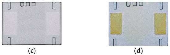 The test samples were prepared with a VDMOS chip, as illustrated in Figure 1a, with dimensions of 4008 μm × 2860 μm and a pad area of 1500 μm × 850 μm. To realize the OPM structure with partially coated metal pads and ensure a certain amount of redundancy, a metal mask measuring 1300 μm × 700 μm and possessing a thickness of 1 μm was employed, as depicted in Figure 1b. Upon completion of the sputtering process, electron microscopy was performed on the samples, revealing that the coating layer was deposited well on the pad area with a substantial amount of redundancy around the pattern. This is demonstrated in Figure 1c,d, which demonstrates that the above technique could provide excellent pattern transfer and satisfy the requirements for OPM structures. During the wire bonding process, careful consideration must be given to the dimensions of the package cavity to prevent excessive wire arc height, which could impact subsequent cap sealing procedures.