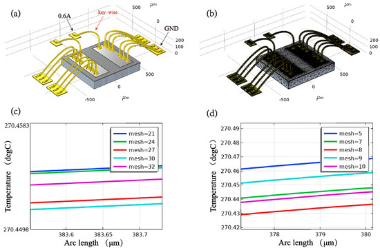 Figure 3. Finite element simulation model and mesh configuration. (a) Geometry model; (b) Grid partition; (c) The impact of the silicon substrate mesh size on the key wire temperature; (d) The impact of the wire and pad mesh size on the key wire temperature.